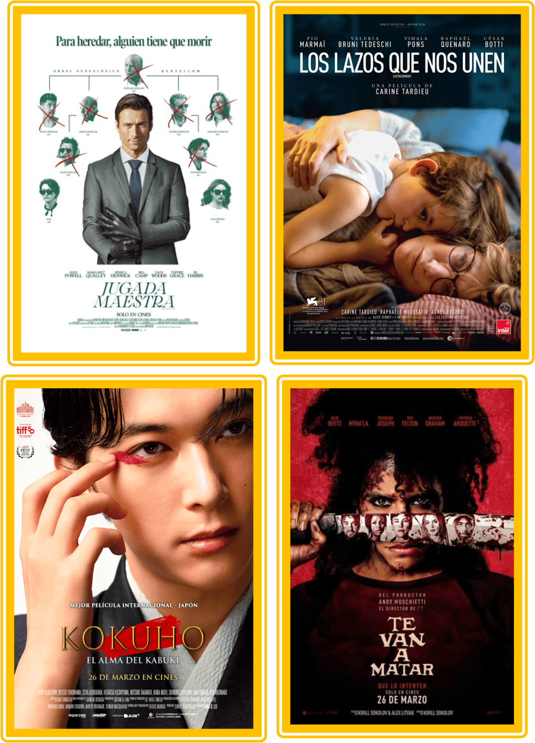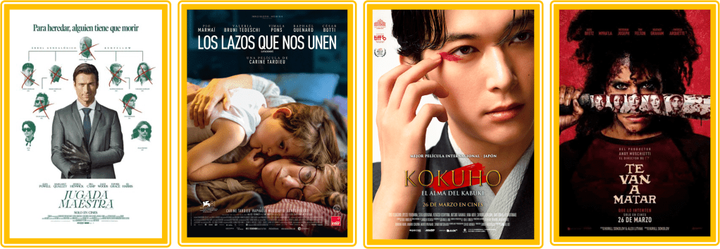 En resumen: si quieres premios y lágrima, ve por Los lazos que nos unen; si te late el cine grande y ceremonial (y no te asusta la duración), Kokuho; si buscas humor negro con colmillo, Jugada Maestra; y si lo tuyo es gore + carcajada + adrenalina, Te Van a Matar. Y como siempre, revisa horarios y complejos: la cartelera cambia por ciudad y por sala.