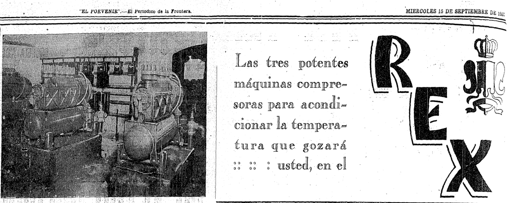 El 20 de agosto de 1937 previamente a inaugurarse lo que el REX anunciaba como sus atracciones para el público era: “El único con Clima Artificial” y mucha de su publicidad estaba fincada en esta nueva comodidad, algo muy comprensible en una ciudad como Monterrey en dónde predominan durante el año los tiempos cálidos y que durante el verano el calor puede llegar a ser verdaderamente insoportable y alcanzar temperaturas de hasta 40°C.