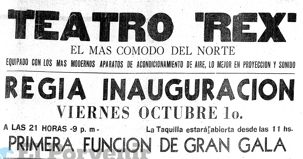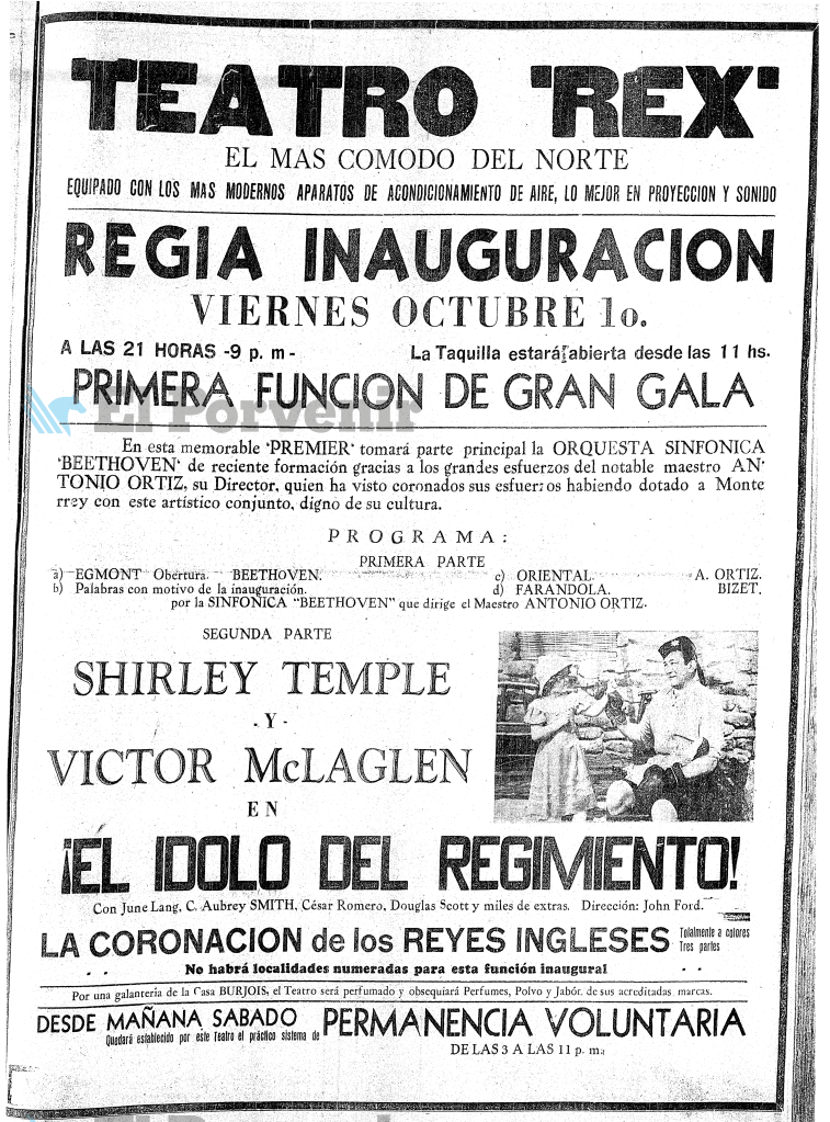 En las páginas del periódico EL PORVENIR de Monterrey, NL, se puede leer que abrió sus puertas al público al día siguiente, el sábado 2 de octubre de ese 1937 con la proyección de la película ¡EL ÍDOLO DEL REGIMIENTO! (Wee Willie Winkie) llevando en el reparto principal a: Shirley Temple y Victor McLaglen.