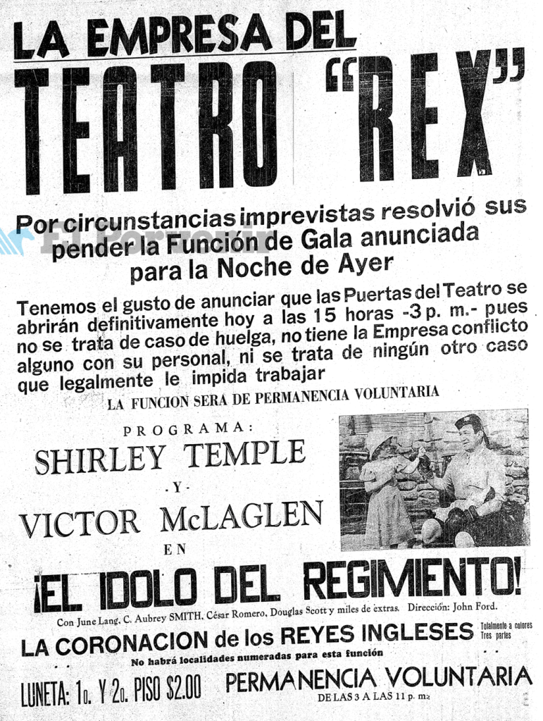El Cine REX tercera construcción sobre el mismo predio debía ser inaugurado acorde a la agenda original el viernes 1 de octubre de 1937, pero el evento se canceló de última hora por cuestiones sindicales.