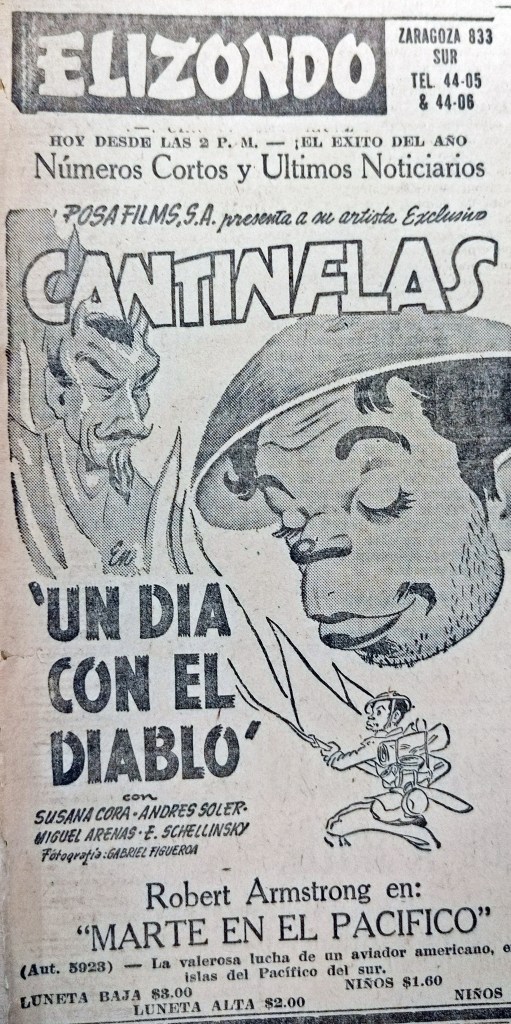 Películas del gran mimo del cine nacional Mario Moreno CANTINFLAS como UN DÍA CON EL DIABLO estrenada el viernes 28 de noviembre de 1945 en funciones desde las 2:00 pm.