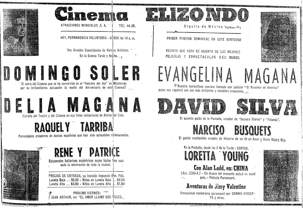 DOÑA BÁRBARA, que tuvo su gran Premiere el 29 de septiembre de 1943 e incluso vino a Monterrey a la Premiere la gran diva de México María Félix -ahora sí-. A las 2:30 pm fue la primera función y el costo del boleto fue: Luneta Baja $3.00, Luneta Alta $2.00. La función con la presencia de la Diva de México fue a las 8:30 pm. El desplegado no señala algún precio diferente para esta función.