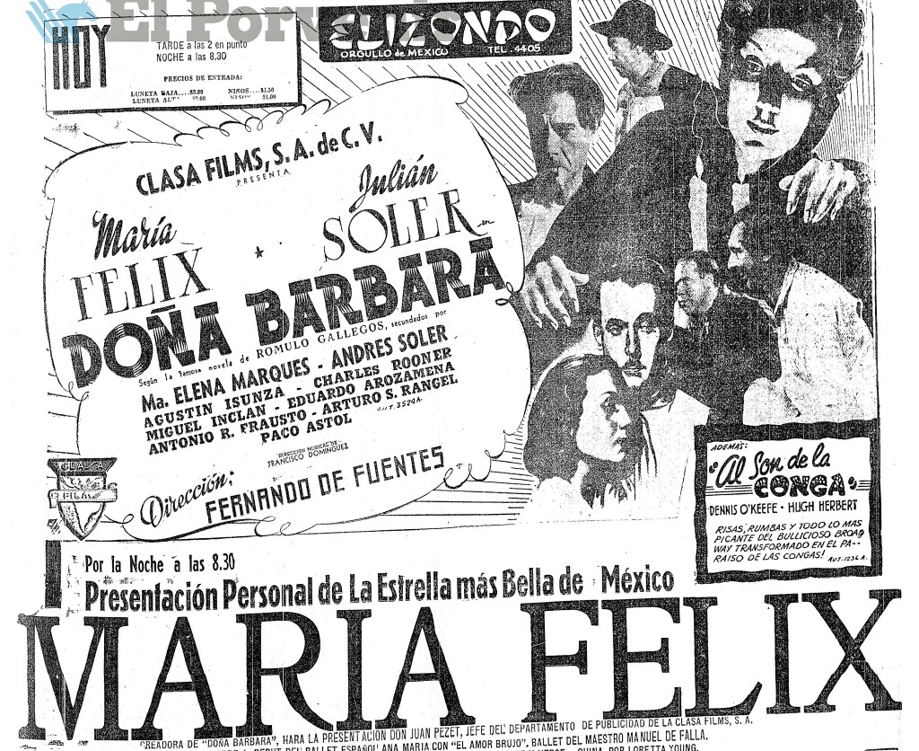 “Hoy por la tarde a los 2.30 se inicia en el suntuoso cinema ELIZONDO la AVANT PREMIERE de “DOÑA BÁRBARA”, de la novela de Rómulo Gallegos, y por la noche se hará la presentación personal de su hermosa intérprete: MARÍA FÉLIX, quien invitada por AMSA, aceptó venir a esta Premiere, virtud de no haber podido hacerlo en la inauguración del mismo, por haber tenido que asistir en México al estreno avanzado de esta propia cinta.