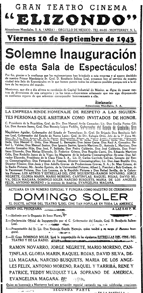 El Gran Cinema ELIZONDO Se inauguró exactamente el viernes 10 de septiembre de 1943, a las 20:45 Hrs. Los precios de los boletos para asistir a la ceremonia fueron: Luneta Baja $10.00 Pesos y Luneta Alta $7.50 y ya incluían el impuesto para la Beneficencia Pública. En ese mismo día cines como el LÍRICO, FLORIDA y RODRÍGUEZ vendían sus boletos de Luneta en $1.00 Peso.