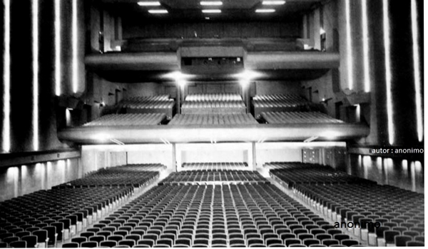 Sin buscar rebuscamientos anticuados los diseñadores del Cine Monterrey encontraron una bella solución al problema de hacer una sala bella, sobria y elegante. No hay aquí superabundancia de muebles o de motivos decorativos. Se trata simplemente de una sala bella, bien acondicionada y cómoda.