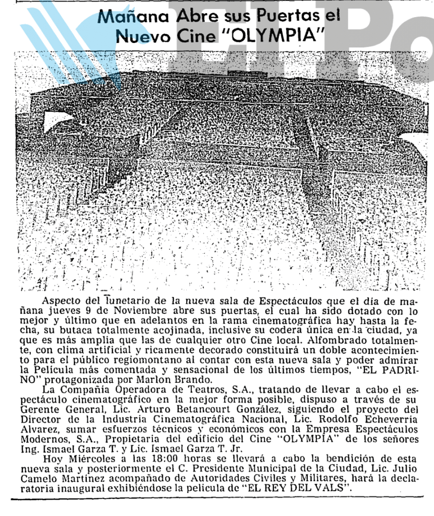 El nuevo y moderno cine OLYMPIA (Escrito así con “Y”) estuvo construido en el mismo espacio que ocupó antes el cine REX, se inauguró -como se puede leer en la página 5 de la Segunda Sección del periódico EL PORVENIR el miércoles 8 de noviembre de 1972– a las 18:00 Hrs. con la bendición de la sala y posteriormente el Presidente Municipal de Monterrey, el Lic. Julio Camelo Martínez tuvo a su cargo la declaratoria inaugural…