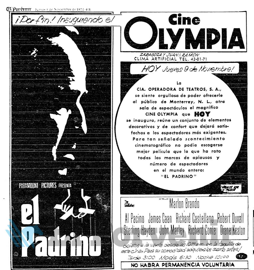 El jueves 9 de noviembre de 1972 el OLYMPIA inicia sus funciones al público con la película EL PADRINO (The Godfather) ganadora de tres premios Óscar de la Academia de cine de los Estados Unidos. Mejor Película, Mejor Actor: Marlon Brando y Guion adaptado de otro medio. La dirección a cargo de Francis Ford Coppola. Se mantuvo en cartelera por 12 semanas a partir de ese 9 de noviembre de 1972.