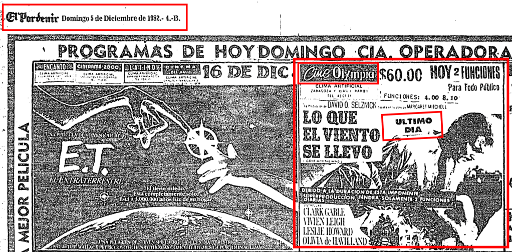 El OLYMPIA presentó sus últimas funciones el domingo 5 de diciembre de 1982… simbólicamente la última película que exhibió fue un “Reprise” de LO QUE EL VIENTO SE LLEVÓ (Gone with the Wind) y un rótulo en la cartelera que pone “Hoy último día”…