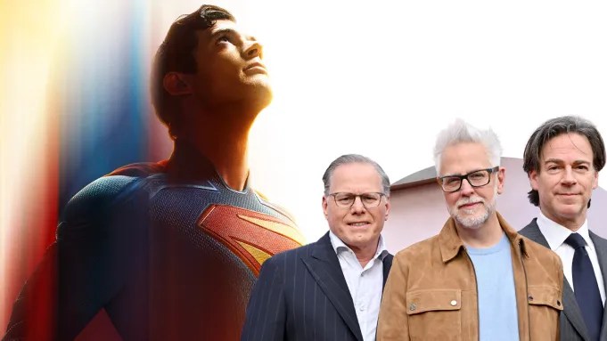 (L-R) David Zaslav, James Gunn y Peter Safran y el marketing (DC/Getty)