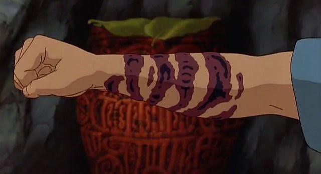 Al defender a su gente, Ashitaka mata a la criatura, pero en el enfrentamiento recibe una herida en el brazo. Esa herida no es común: se trata de una maldición sobrenatural. El rencor del dios lo marca con una cicatriz viva que se extiende por su piel y le otorga una fuerza sobrehumana, pero que también lo va consumiendo poco a poco, acercándolo a la muerte.