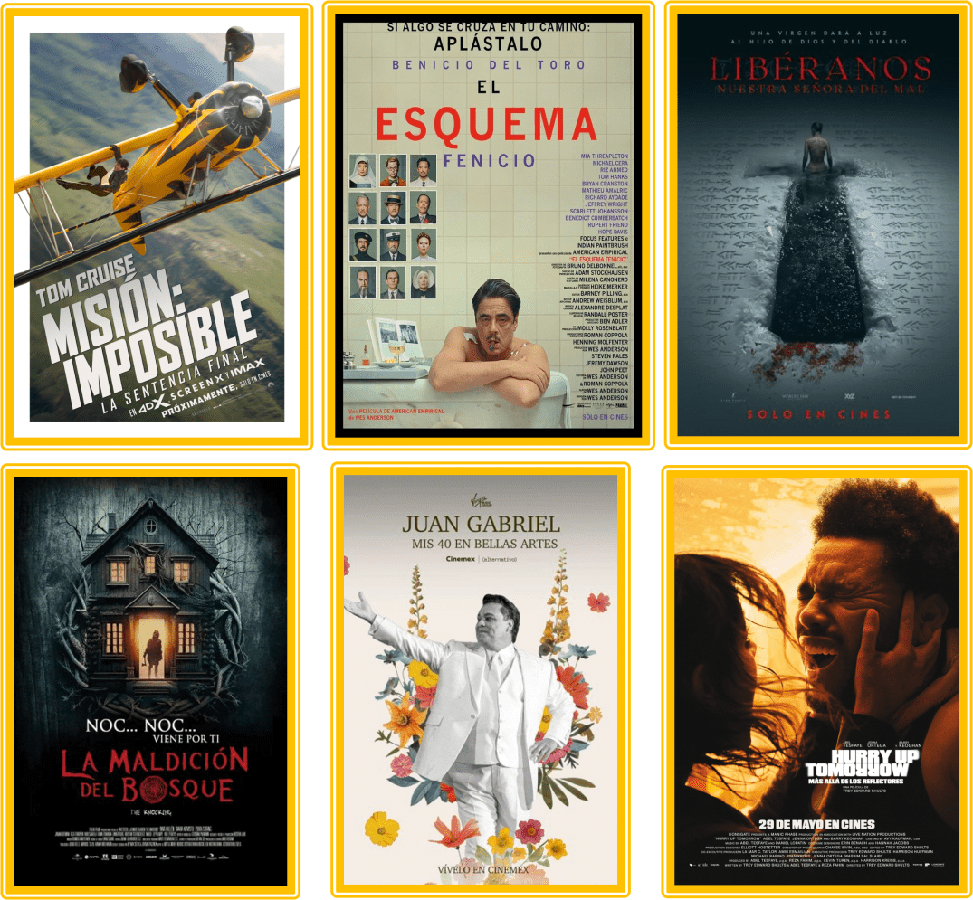 ¿Vas al cine?… Revisa aquí los principales estrenos de esta semana. Misión: Imposible – La Sentencia Final ya en «corrida» normal y Lilo y Stitch se sigue con infinitos horarios. De los estrenos destaco para quienes gusten del cine «gourmet» EL ESQUEMA FENICIO la nueva entrega del ultra creativo e ingenioso Director tejano Wes Anderson. Se suman tres más en la línea del horror y el suspenso: LIBÉRANOS, LA MALDICIÓN DEL BOSQUE y HURRY UP TOMORROW: MÁS ALLÁ DE LOS REFLECTORES.
