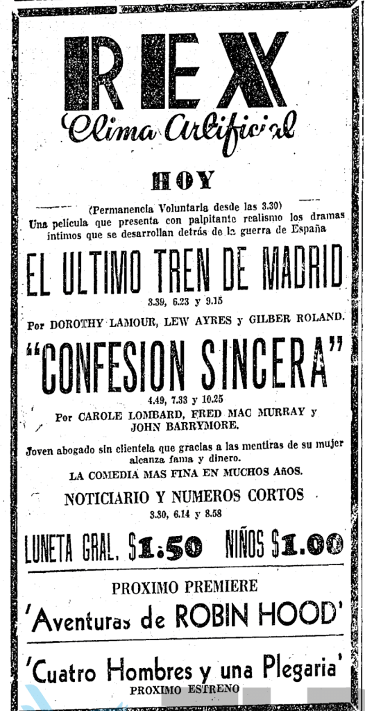 A la derecha el desplegado anunciando la película en el periódico ELPORVENIR publicado el viernes 22 de julio de 1938.