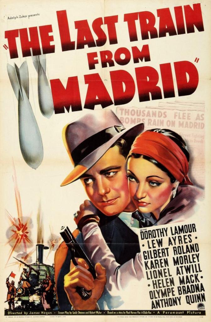 A la derecha en la fotografía el legendario cine REX (1937-1971) que exhibía desde el viernes 22 de julio de 1938 -como se puede ver en la marquesina y en la manta que cuelga de la misma- la película norteamericana EL ÚLTIMO TREN DE MADRID (The Last Train from Madrid) protagonizada por: Dorothy Lamour, Lew Ayres, Gilbert Roland y Anthony Quinn.