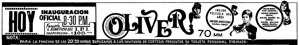 Se proyectó la película OLIVER! en una función a beneficio del IPI y el costo del boleto fue de $100. La cinta conquistó 5 Óscares de la Academia y entre ellos a Mejor Película y Mejor Director (Carol Reed).