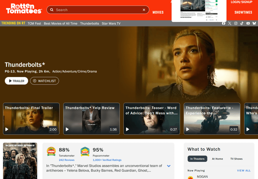 Recepción crítica positiva: Con un 88% de críticas favorables en Rotten Tomatoes y una puntuación de 69/100 en Metacritic, Thunderbolts ha sido elogiada por su enfoque fresco y humano dentro del Universo Cinematográfico de Marvel.